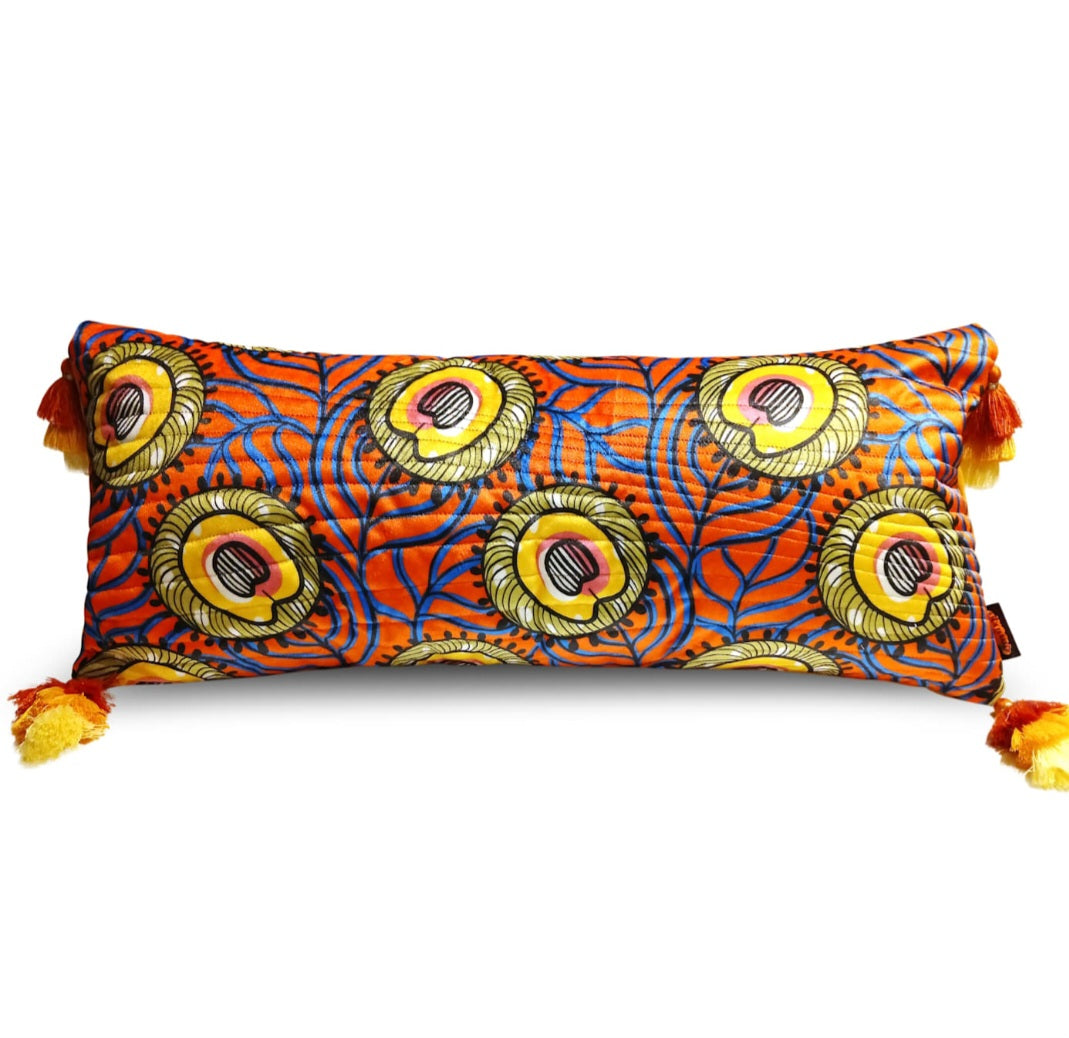 Luxurious quilted velvet lumbar accent pillow designed with an African aesthetic and made by hand for those who love home decor that is both cozy and creative.